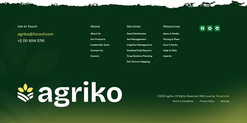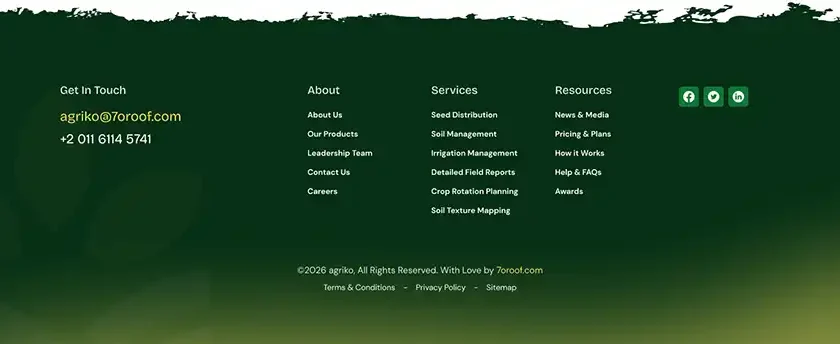 Get In Touch agriko@cmsheroes.com +2 011 6114 5741 About About Us Our Products Leadership Team Contact Us Careers Services Seed Distribution Soil Management Irrigation Management Detailed Field Reports Crop Rotation Planning Soil Texture Mapping Resources News & Media Pricing Plans How It Works Help & FAQs Awards Facebook Twitter LinkedIn ©2025 Agriko, All Rights Reserved. […]